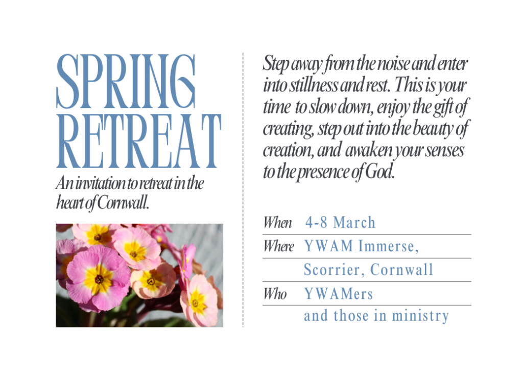 If you would like to join our retreat there’s still time to sign up. It’s from 4th – 8th March. More details can be found at ywamimmersecornwall.com/springretreat